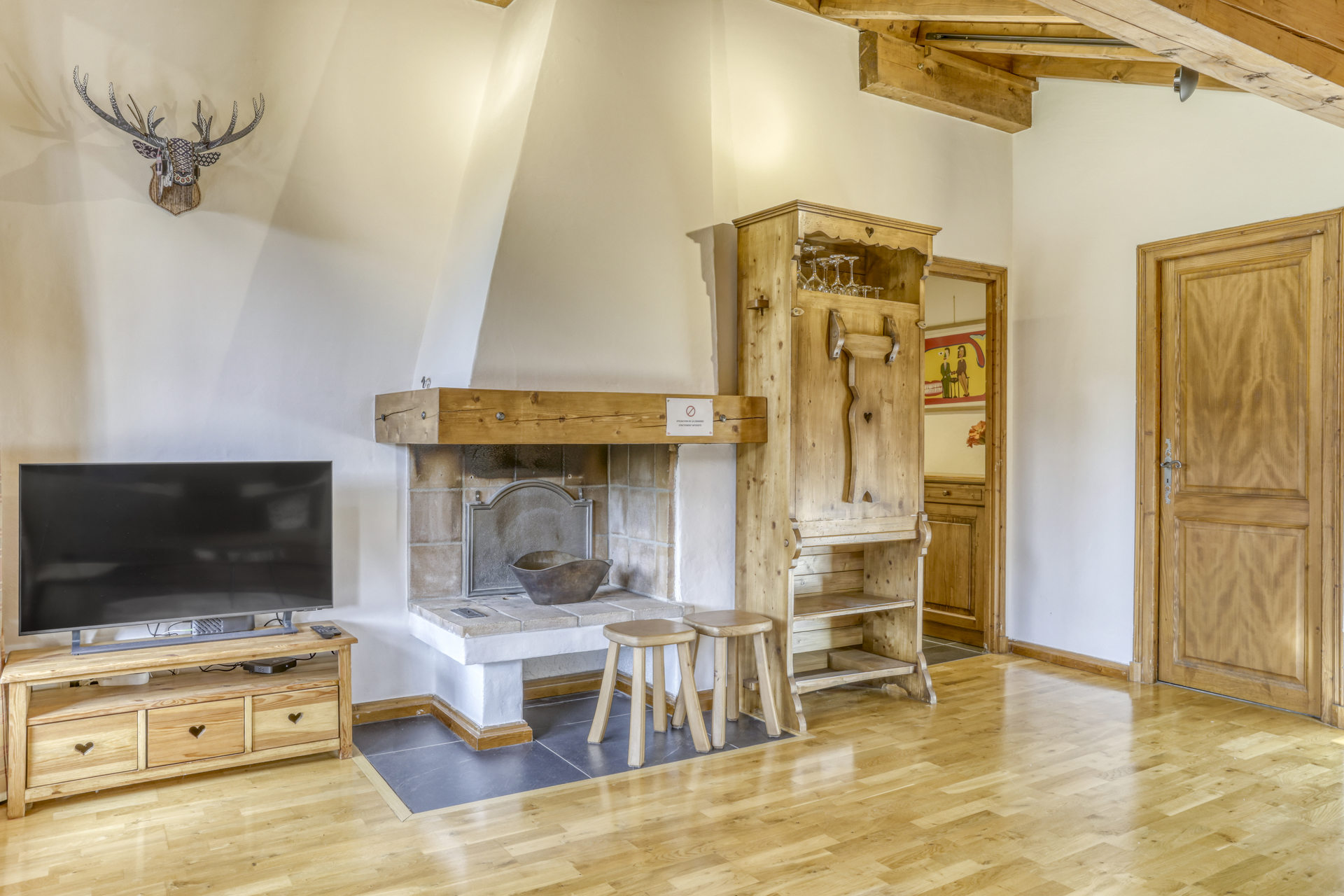 – séjour en partie mansardée avec cheminée décorative (ne pas utiliser), canapé-lit gigogne (2 lits de 90/190cm)