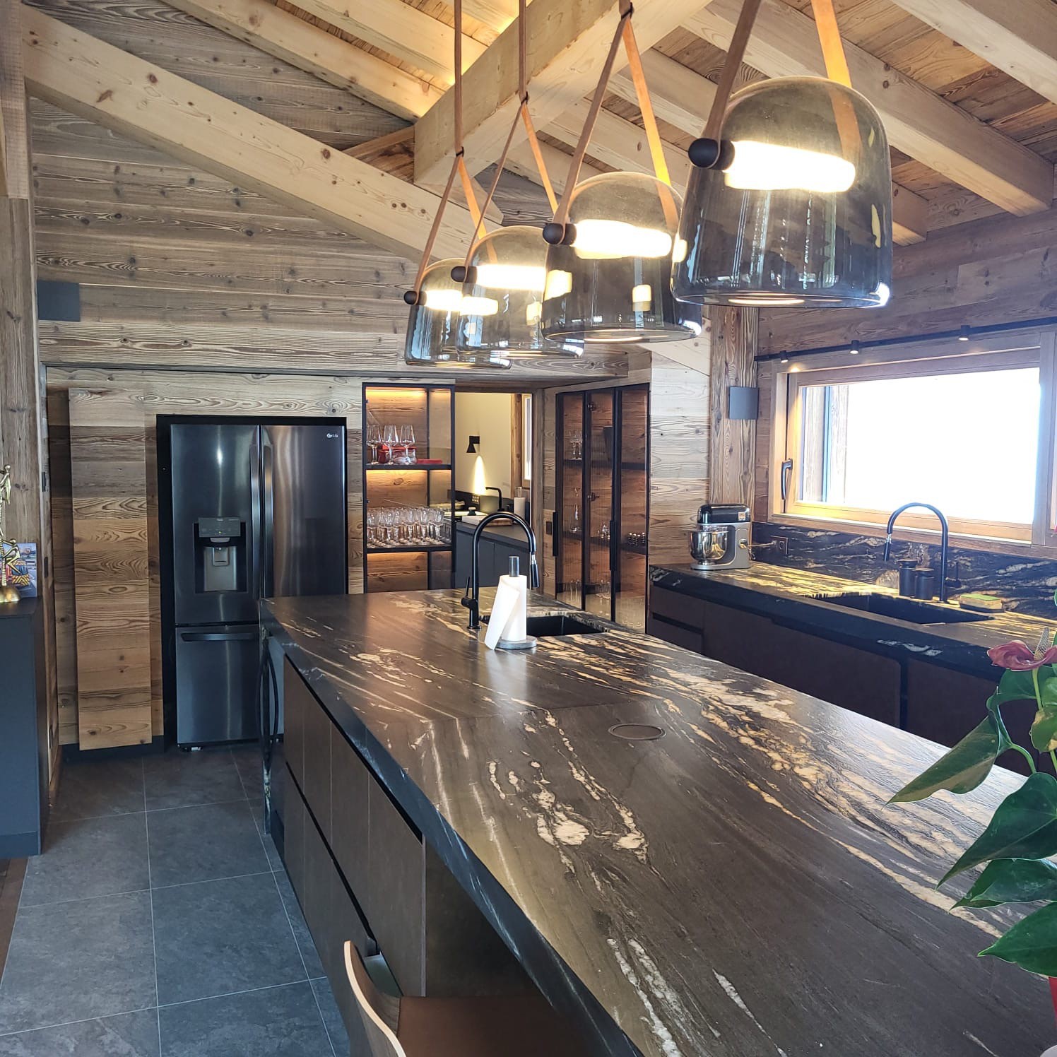 – Une cuisine ouverte équipée avec cheminée et une pièce réservée au stockage
