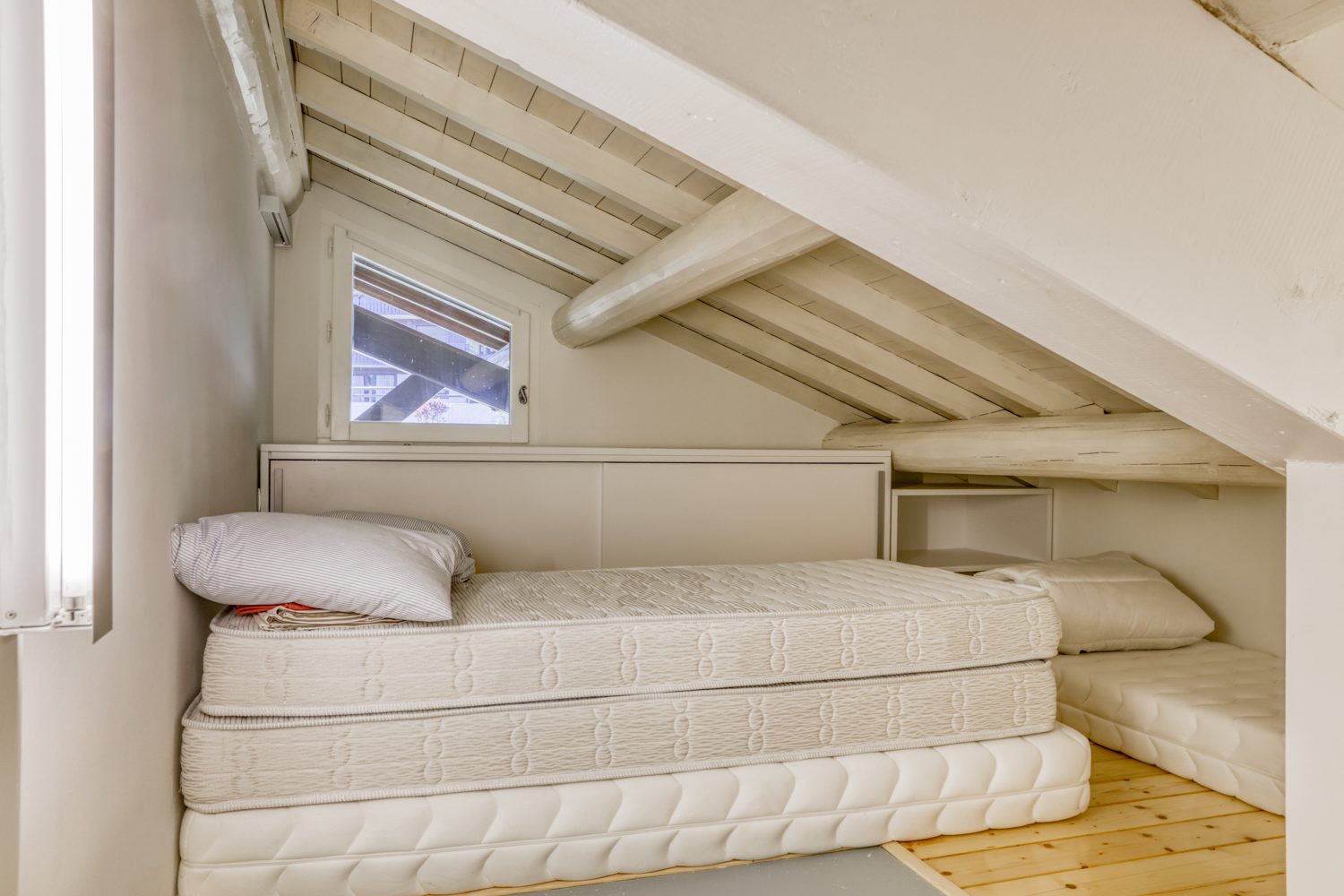 MONT D’ARBOIS, CONFORTABLE APPARTEMENT DE 5 PIECES, RENOVE REF. 7615, au 1er et dernier étage d’une résidence recherchée, avec accès immédiat aux pistes de ski. Beaucoup de charme pour cet appartement contemporain comprenant : entrée, cuisine indépendante, salle de séjour avec cheminée donnant sur terrasse ; à l’étage, une première chambre mansardée avec placard, une salle d’eau et toilettes, une seconde chambre, en-suite avec salle d’eau et accès solarium, une troisième chambre s’ouvrant sur balcon ; à l’étage supérieur : une quatrième chambre mansardée, avec lavabo et toilettes. Surface LC 96,95 m²+25,30 m² < 1,80 m, soit une surface totale de 122,25 m². Vendu avec un garage boxé, une cave et un placard à skis. Bien soumis au statut de copropriété (234 lots dont 65 à usage d’habitation, répartis sur 3 bâtiments) ; Budget prévisionnel moyen des charges 6 278 €/an. Pas de procédure en cours.