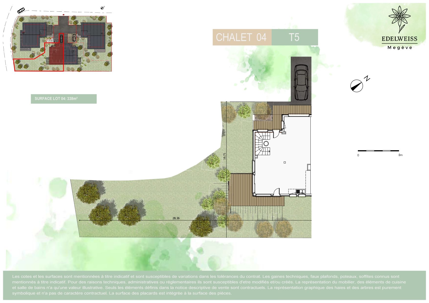 Le chalet sera établi sur une parcelle de terrain de 328 m² et aura une surface habitable de 125,57 m², pour une surface totale de 131,66 m². Garage une place , jardin privatif avec terrasse de 244,06 m².